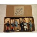 Boite de soldats de la marque Française SFBJ (bien connu également dans le domaine des poupées a tète de porcelaine). Fabriqué vers la fin du 19éme Siècle, début 20éme, cette boite se compose de 6 figurines en composition, en très bon état d'origine, a signaler des manques de peinture , aucune restauration n'a ét&e