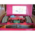 1/43 RAIL CAR SET WAS MADE IN 1947.THE TRACK FORMED A FIGURE 8.THE METAL BODIES FOR THE CARS WERE MADE BY SAFAR.THE TRANSFORMER HAD CONTROLS ON BOTH SIDES FOR EACH LANE.RARE